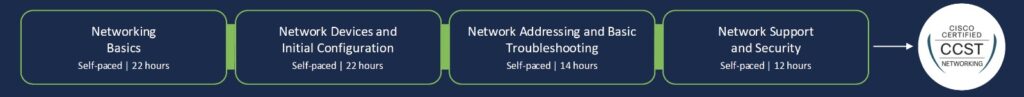 Programul de formare este structurat în 4 module disponibile ca și cursuri individuale self-paced pe platforma de learning Cisco NetAcad. Pentru o pregătire completă, îți recomandăm să urmezi toate cele 4 module, în ordinea de mai jos: