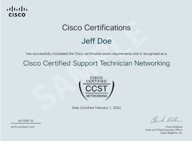 Certificarea CCST Networking poate fi obținută prin susținerea și promovarea unui examen online, de acasă, într-un mediu securizat, supravegheat la distanță (online proctoring). Examenul are o durată de 50 de minute, conține întrebări de tip grilă și se desfășoară în limba engleză.